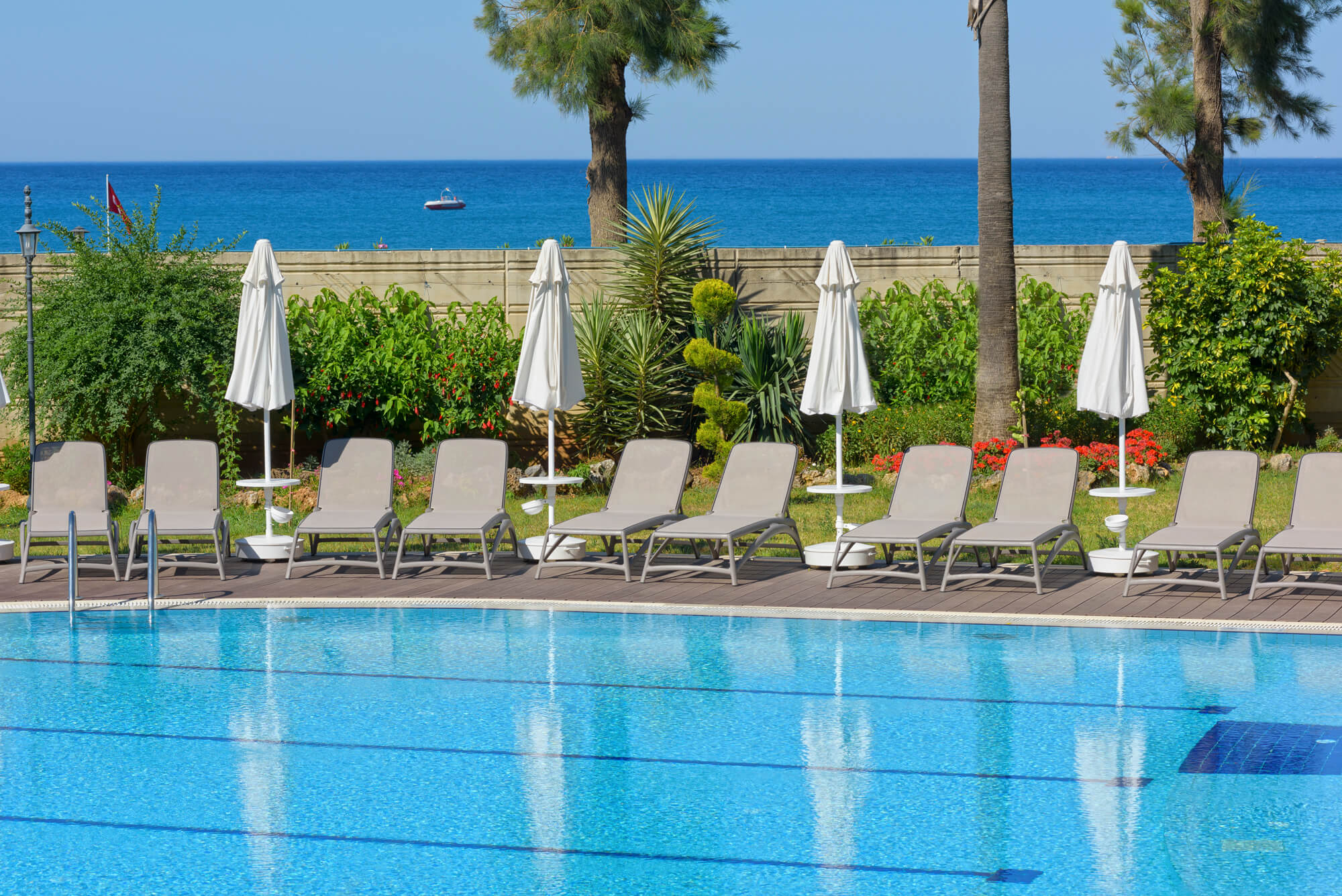 Собствен пясъчно-чакълест, чрез подлез. Плажни кърпи, чадъри, шезлонги на плажа и при басейна - безплатно, на кея - срещу доплащане.