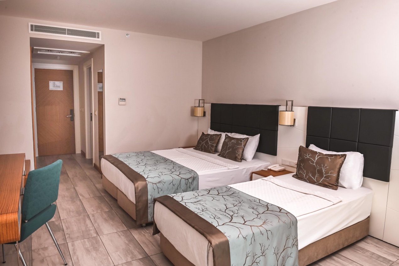 Стаи Main Building: 244 Hotel Standard sea view room (изглед море - 28 м2), Hotel Standard side sea view room (частичен изглед море - 28 м2), Hotel Standard land view room (изглед суша - 28 м2), 15 Dublex room (на 2 етажа - 2 спални, 2 бани, 1 диван - 56 м2), 7 Deluxe suite room (1 спалня, хол, 1 баня + джакузи - 57 м2), 4 Suite room (1 спалня + диван, 1 баня – 50 м2), 9 Large Standard room (32 м2).