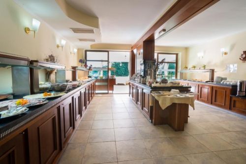 Закуска на бюфет /07:30 – 10:00/ - различни видове кафе и чай, плодови сокове, прясно мляко и какао, различни видове хляб, бротчета и кроасани, банички и/или сладки, корнфлейкс, мюсли, плодове, кисело мляко, масло, маргарин, различни видове мармалад, мед, варени яйца, бъркани яйца и/или яйца на очи, пържен бекон, вурстчета, кренвирши, сирене и/или кашкавал, салами, шоу кукинг станции за приготвяне на палачинки и яйца на очи.