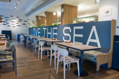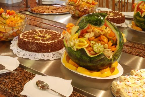 Обяд на бюфет: / 12:30 - 14:30 ч./ - интернационална кухня,пресни салати и предястия, супи, риба, паста, различни видове меса, вегетариански и диетични ястия, пресни плодове, десерти, сладолед.Безалкохолни напитки, бира, наливни вина и топли напитки.