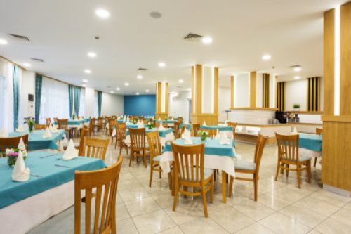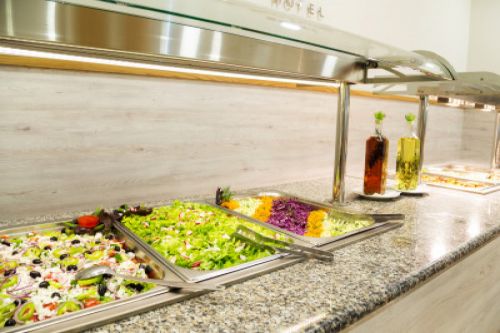 Закуска на бюфет / 08.00 - 10.00 / - различни пресни плодове и зеленчуци, сирена, корнфлейкс, кроасани, палачинки, яйца, студени и топли напитки. Напитки - чай, кафе, мляко, минерална вода от диспенсър, постмикс сокове.