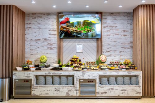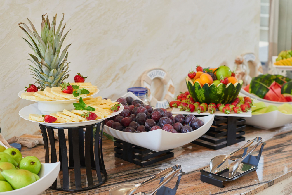 Закуска на блок маса /07:00 – 10:00/ – разнообразие от топли и студени ястия, ястия с яйца, различни млечни продукти, колбаси и сирена, печива, зърнени храни, плодове, вода, безалкохолни напитки, кафе, топли и студени напитки