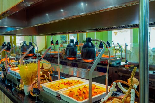 Обяд на бюфет: 12:30-14:00 ч. - Основен ресторант (2-ри етаж) - Бюфет с пресни салати, топли и студени супи, разнообразие от топли ястия, шоу-кукинг, детски и бебешки бюфет, прясно изпечен хляб, десерт бар, сезонни плодове. Бира и вино.