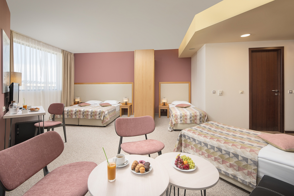 Закуска на бюфет: 07:30-10:00 ч. - топли и студени ястия, яйчени специалитети, млечни продукти, колбаси и сирена, зърнени храни, плодове и зеленчуци, сладкиши и др., включени топли и студени напитки.