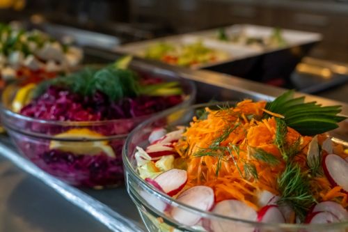 Обяд на бюфет: 12:00-14:00ч. – салати, супи, предястия, основни ястия, десерти, плодове и включена вода, безалкохолни напитки, наливна бира, вино и селекция от местни и вносни алкохолни напитки.