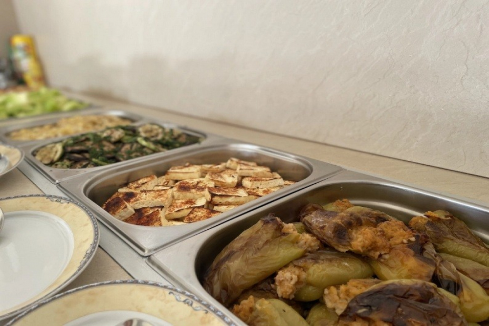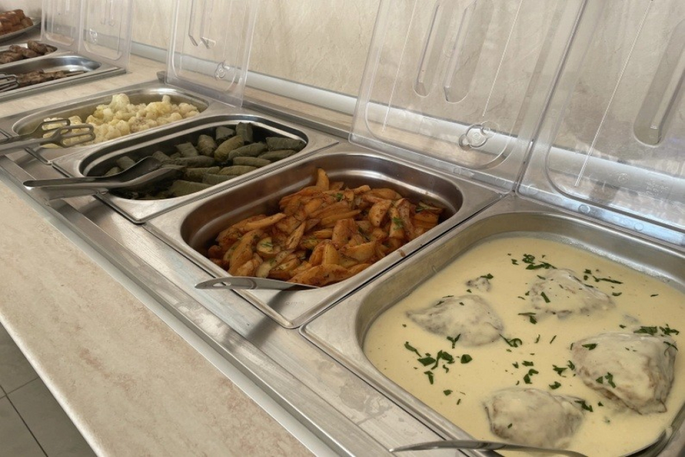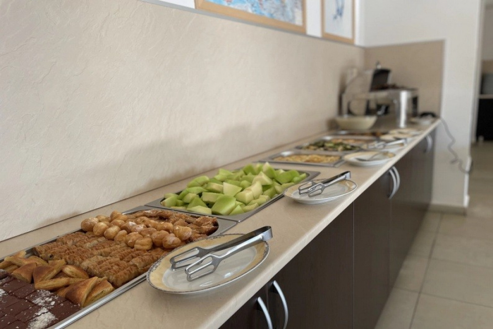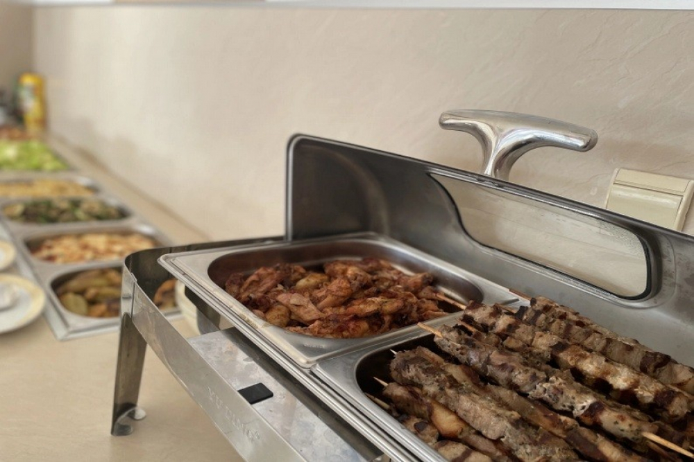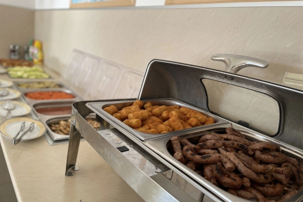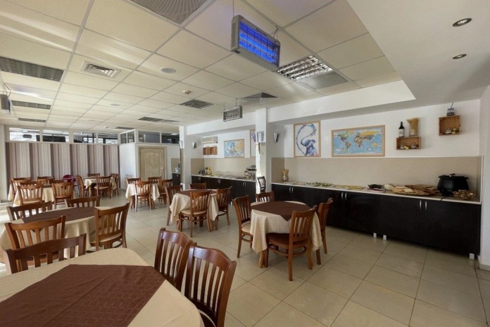 Закуска на бюфет /08:00 – 10:00/ - разнообразие от топли и студени ястия, яйчени специалитети, разнообразие от млечни продукти, колбаси и сирена, селекция от хлебни изделия, зърнени храни, плодове и зеленчуци, студени и топли напитки, безалкохолни напитки от пост-микс машина. При по-малко от 20 дущи в хотела изхранването е по сет меню.