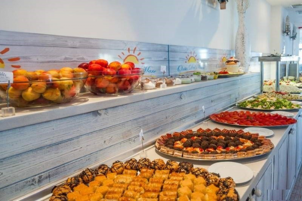 Вечеря на бюфет: 18:30 – 21:00 ч. Вечерята в Оазис дел Маре включва разнообразие от пресни зеленчуци, салати, супи, предястия, вегетариански ястия, готвени ястия, паста с различни видове сосове, скара , рибни ястия, различни видове гарнитури, плодове и десерти.