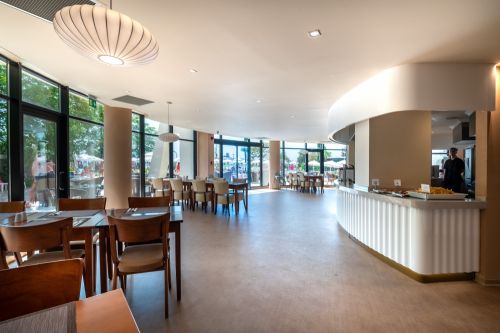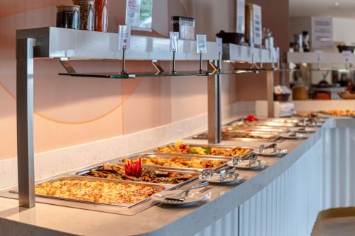 Закуска на бюфет /07:00 - 10:00 ч./ - международна кухня, разнообразие от топли и студени ястия, вегетарианска и здравословна храна, включително детски и диетичен кът, яйчни специалитети, млечни продукти, колбаси и сирена, сладкиши, зърнени храни, плодове, вода, безалкохолни и топли напитки, чай и кафе.