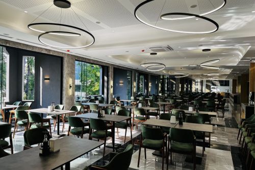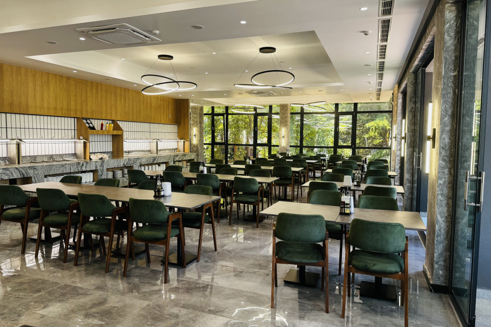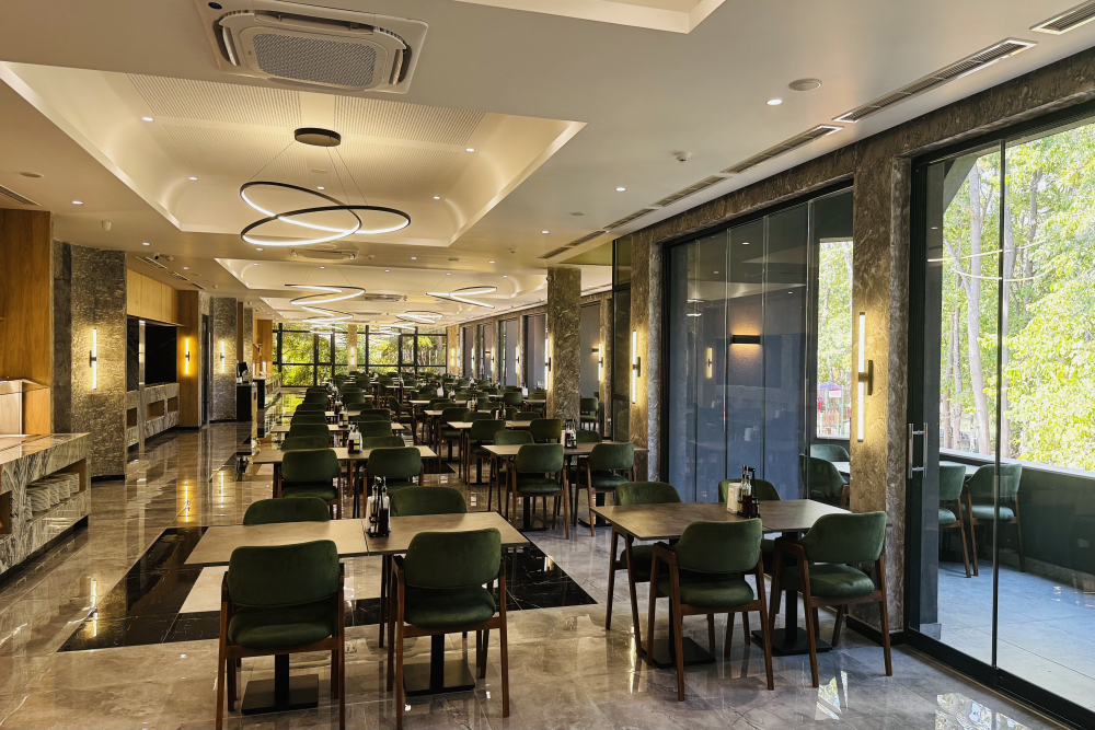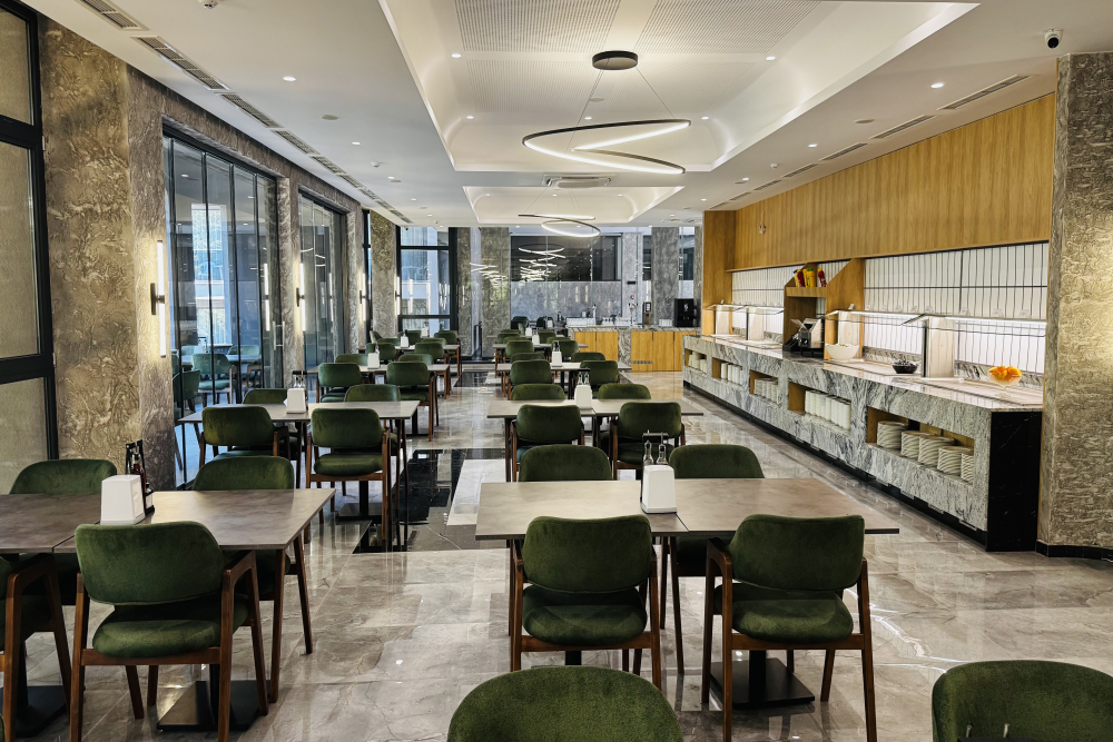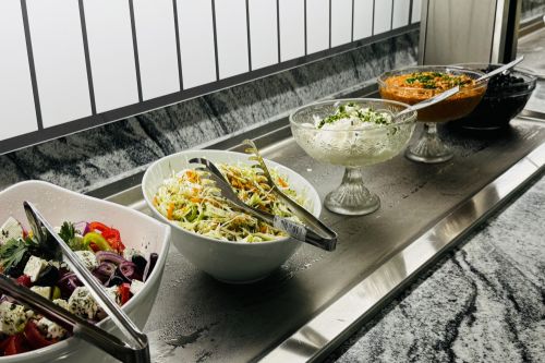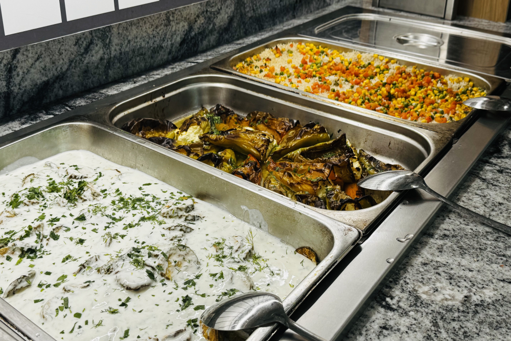 Обяд на бюфет /12:00 – 14:00/- селекция от пресни салати и супи, богато разнообразие от български и международни ястия, вегетариански и месни ястия, паста, селекция от хлебни изделия, сладък бюфет с разнообразни десерти.