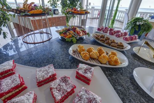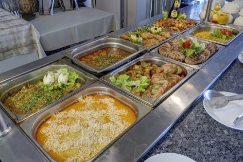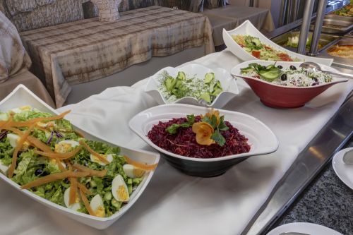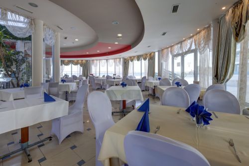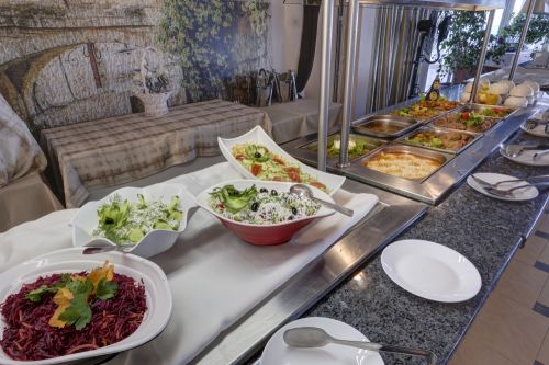 Закуска /08:00 - 10:00 ч./ - на блок-маса в основен ресторант - богато разнообразие от колбаси, сирена, плодове, десерти, прясно изпечени кифлички, кроасани, зърнени закуски, макарони, с включеи топли и студени напитки от машина.