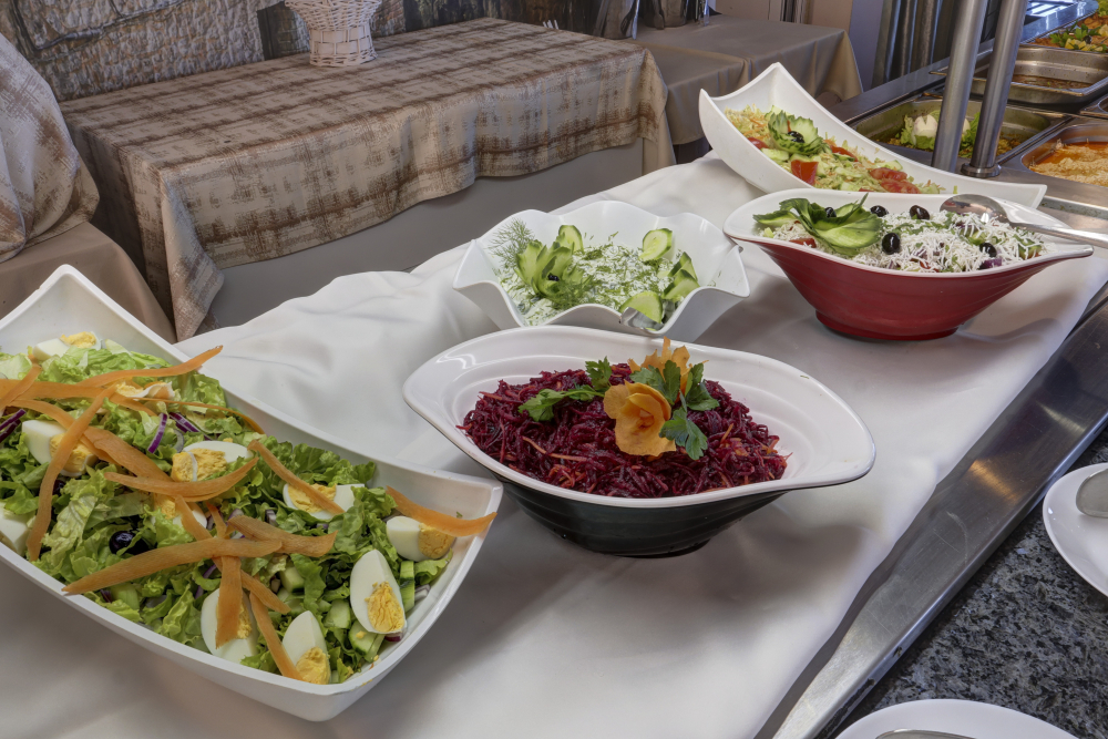 Обяд /12:30-14:30 ч./ - на блок-маса в основен ресторант - интернационална кухня, включваща богат асортимент от пресни салати, предястия, супи, основни ястия, плодове и десерти и вегетарианско меню.