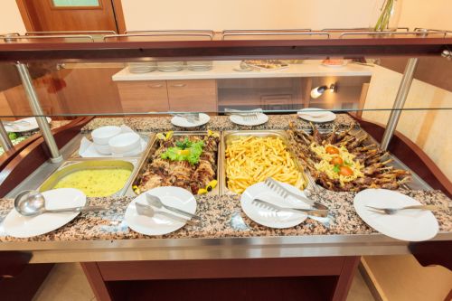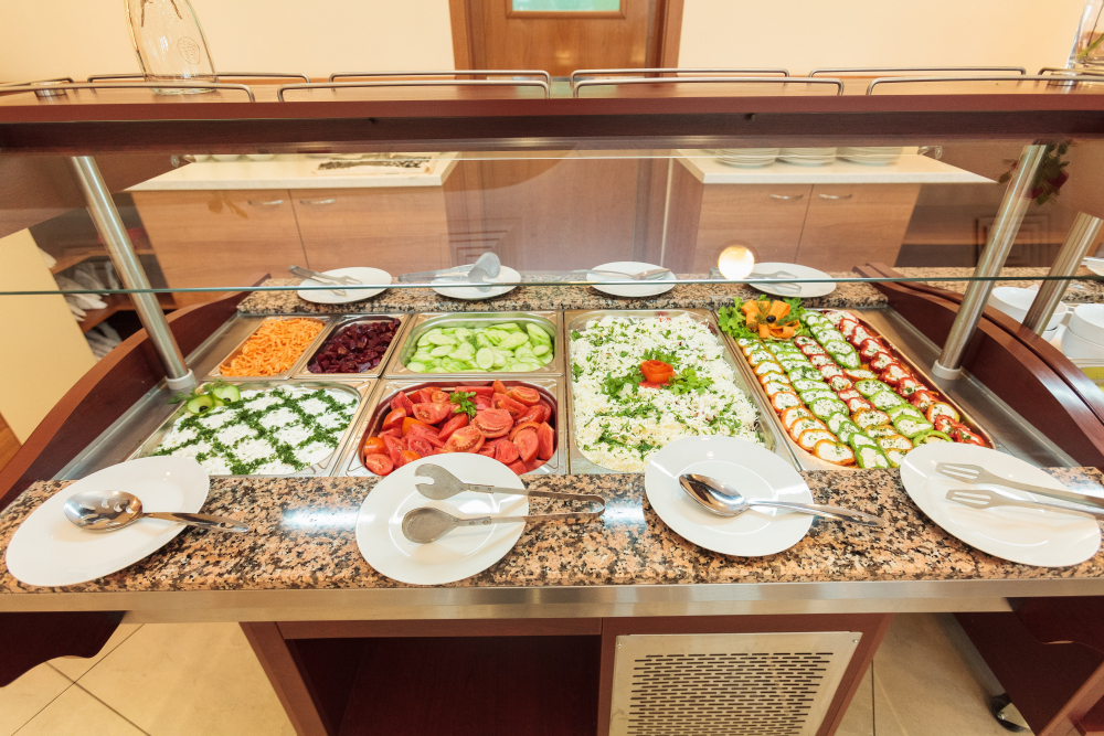 Обяд на бюфет (12:00 - 14:00 ч.) - готвени ястия от свинско, телешко и агнешко месо, риба и рибни деликатеси, пържоли, кюфтета и кебапчета, мусака, боб, леща, зеленчуци, салати, плодове, вегетариански ястия, супи.