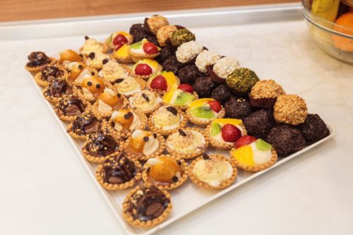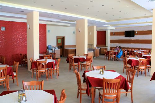 Закуска на бюфет (08:00 - 10:00 ч.) - яйца на очи, бъркани яйца, френски тост, колбаси, бекон, макарони, сандвичи, шунка, салам, масло, мед, конфитюр, кифлички, пайове, плодове, зеленчуци, сирене, чай, мляко, кисело мляко, сокове, кафе, какао.