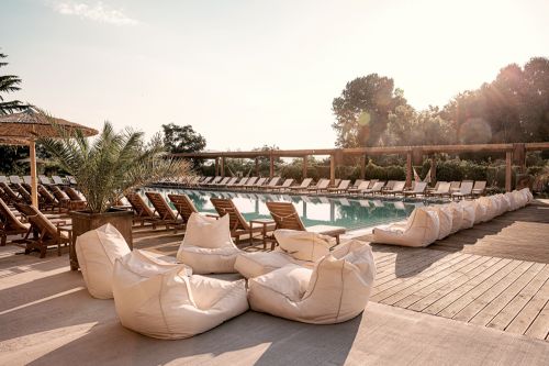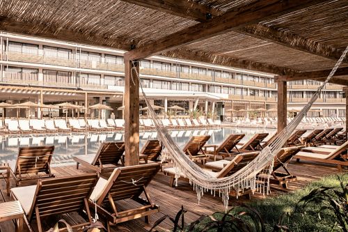 Шезлонги и чадъри край басейните при наличност