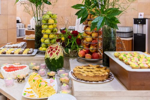 Закуска на бюфет: 07:30-10:00 ч. – топли и студени ястия, разнообразие от яйчени специалитети, млечни продукти, колбаси и сирена, сладкиши, зърнени храни, плодове и зеленчуци и др.