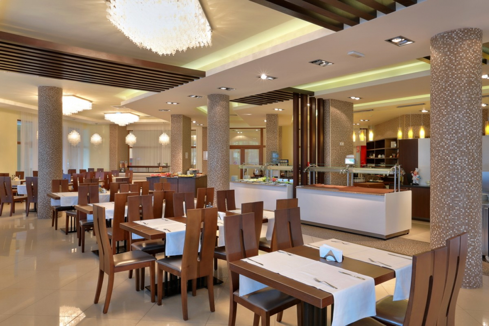 Обяд на бюфет: / 12:30 - 14:30 ч./- разнообразно меню от българската и международната кухня, салати, супи, предястия, основни ястия, десерти, плодове, сладолед, топли напитки, безалкохолни напитки, сокове.