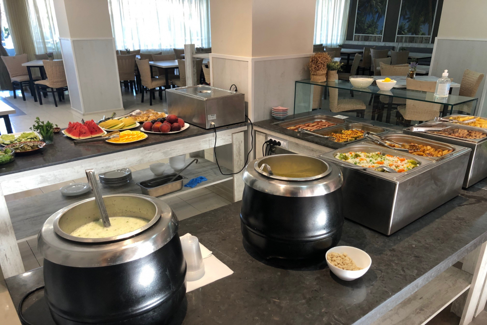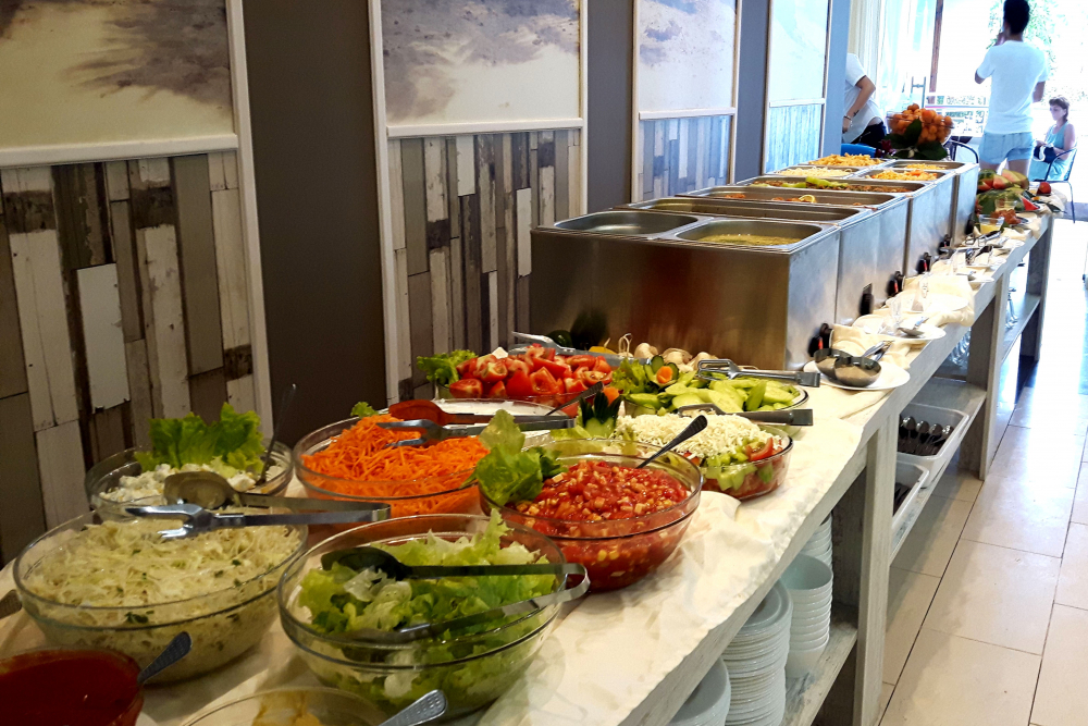 Закуска на бюфет: 08:00-10:00 ч. – разнообразие от топли и студени ястия, колбаси и сирена, млечни продукти, сезонни плодове, зеленчуци, тестени изделия, паста, чай, кафе, сок, трапезна вода и газирани напитки от автомати.