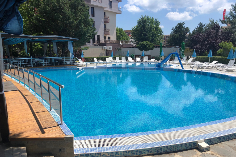 Външен басейн с чадъри и шезлонги