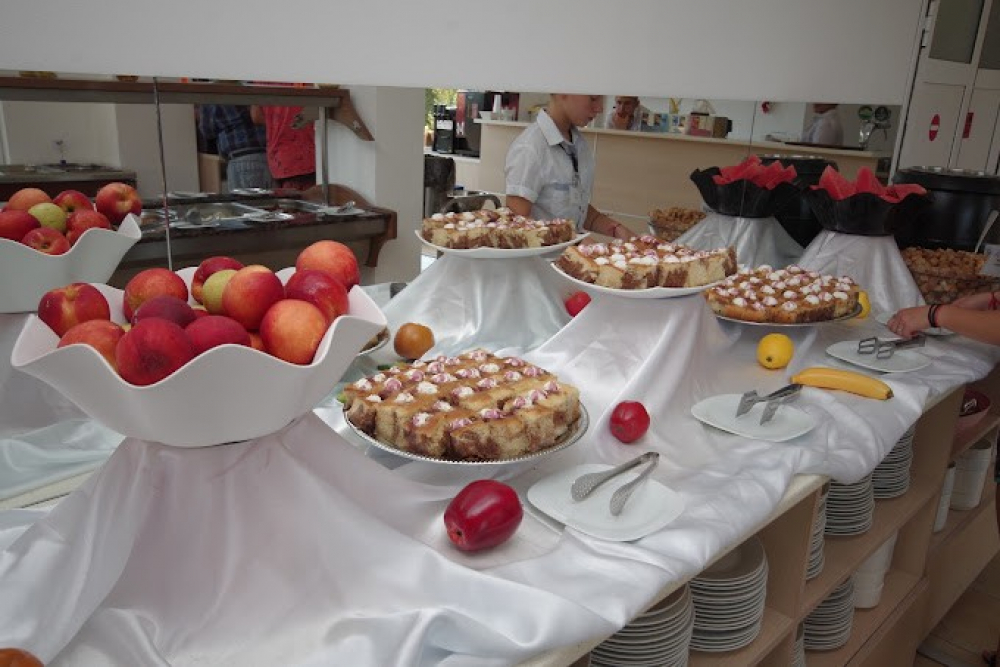 Обяд на бюфет в ресторанта: 12:30 – 14:00 часа - разнообразие от топли и студени ястия, разнообразие от млечни продукти, сезонни плодове, богато разнообразие от ястия от българската и международната кухня. ; с включени топли напитки и наливни безалкохолни напитки от машина, наливна бира, наливно вино и алкохолни напитки