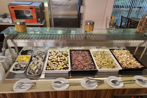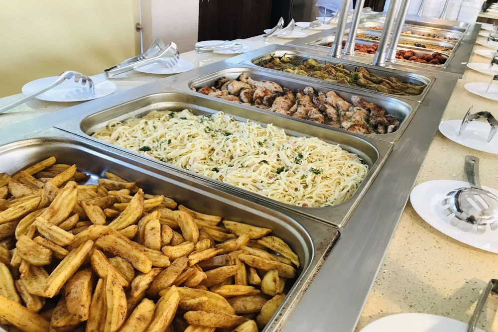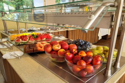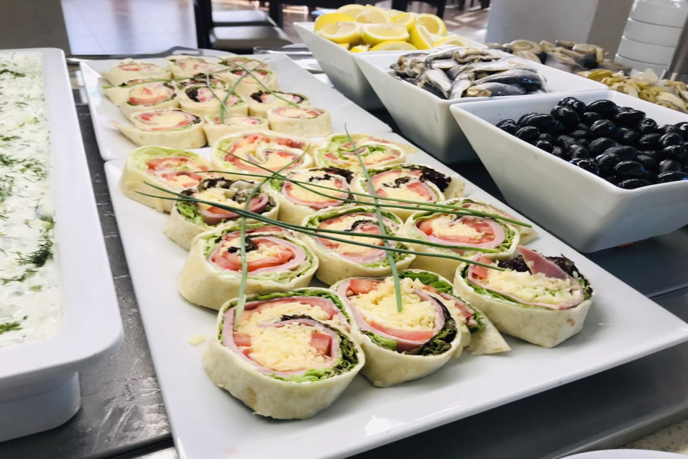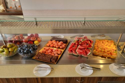 Закуска: 08:00 - 10:00 ч. Закуска на блок маса, масло, мед, два вида конфитюр, пастет, бяло саламурено сирене, българско сирене, ементал, чедър, българско топено сирене, сух колбас, пушен колбас, домати, краставици, маслини, сезонни плодове, макарони, паста, овесени ядки, оризова каша, варени яйца, бъркани яйца, омлети, сандвичи, хляб.
