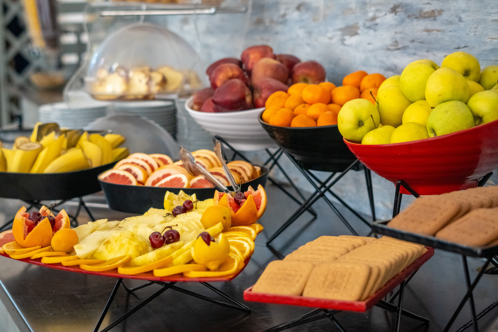 Закуска: 07:30 - 10:00 ч. – бюфет със селекция от ястия, пресни плодове и зеленчуци, сладкиши, топли и безалкохолни напитки, вода и освежаващи сокове.