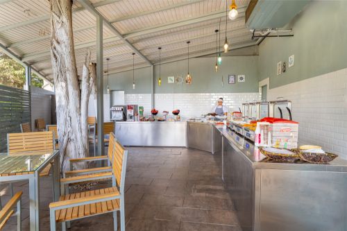 10:00 до 12:00; 15:00 - 17:30 – сладолед, колбаси, сандвичи, сладкиши, пресни плодове и зеленчуци, пица, безалкохолни напитки, топли напитки и наливна бира.