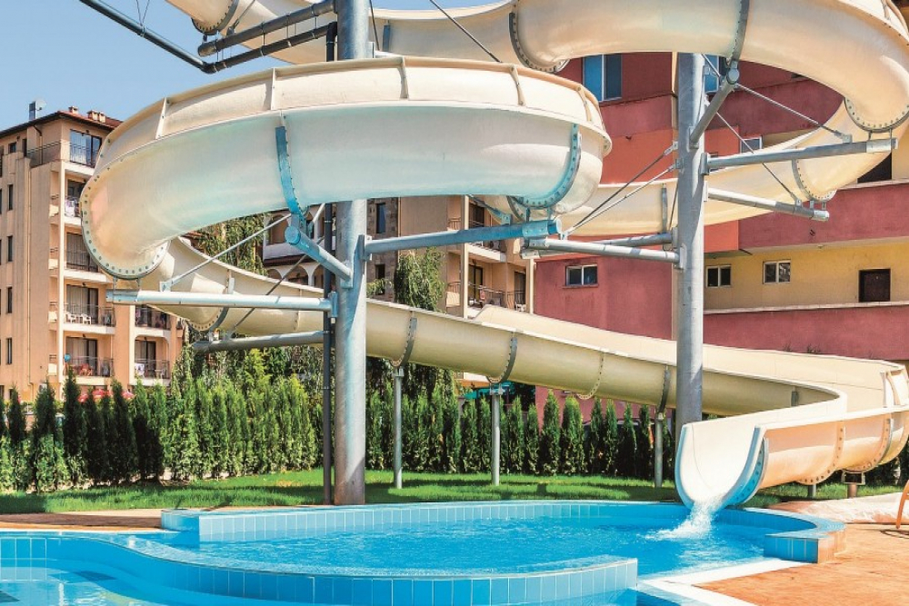 Открит басейн за възрастни със 75-метрова водна пързалка (водната пързалка работи в определени часове), чадъри и шезлонги към басейна според наличността. Кърпи за басейните срещу депозит.