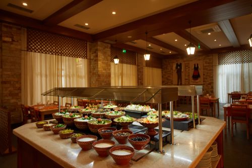 Вечеря на бюфет: 18:30-21:30 ч. – на бюфет за предястия и десерти, а-ла-карт за основните ястия - пресни салати, предястия, вегетариански и месни основни ястия, тестени изделия, хлебни изделия, десерти и др.