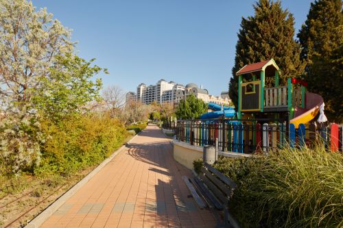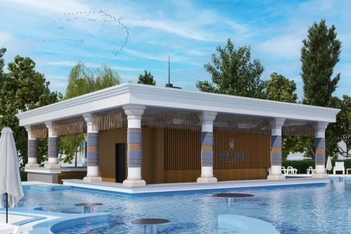 5 открити басейна (от 09:00 до 18:00 ч.): с прилежащо джакузи, инфинити басейн, басейн за гимнастика, детски басейн с водни пързалки/Splash park, бебешки басейн, закрит басейн с джакузи и прилежащ детски басейн