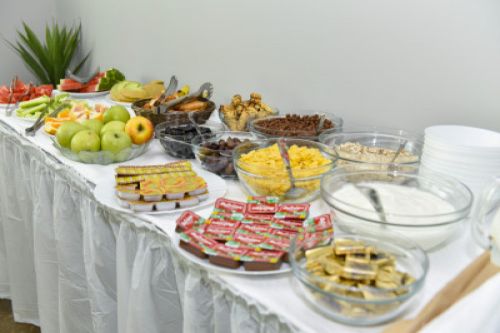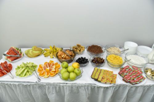 Закуска на бюфет /08:00 – 10:00/ - разнообразие от топли и студени ястия, яйчени специалитети, разнообразие от млечни продукти, колбаси и сирена, селекция от хлебни изделия, зърнени храни, плодове и зеленчуци, студени и топли напитки.