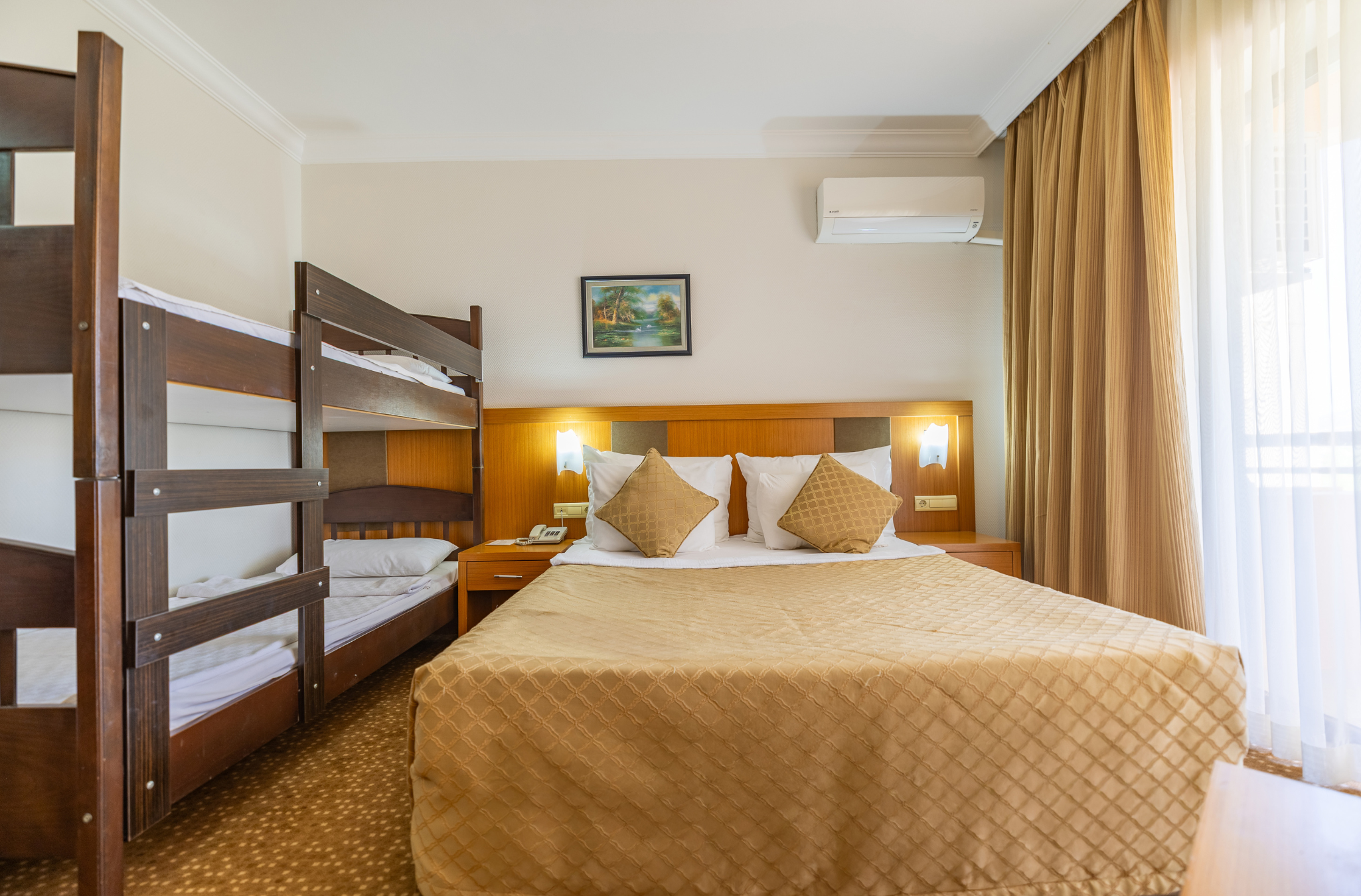 Всички стаи са оборудвани с климатик, телевизор, телефон, баня с душ/вана, сешоар, мини бар (платен), сейф (безплатен), балкон. Почистване на стаите - всеки ден, смяна на спалното бельо и кърпите - 2 пъти в седмицата.