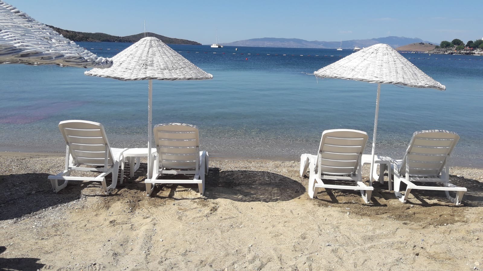 Собствен, пясъчен. Чадъри, шезлонги и плажни кърпи на плажа и при басейна - безплатно. Храна и напитки на плажа се доплащат.