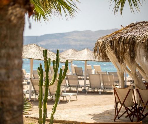 Собствен, пясъчен. Чадъри, шезлонги, матраци и плажни кърпи на плажа и при басейна - безплатно.