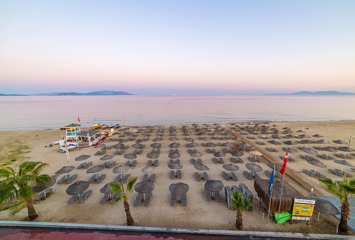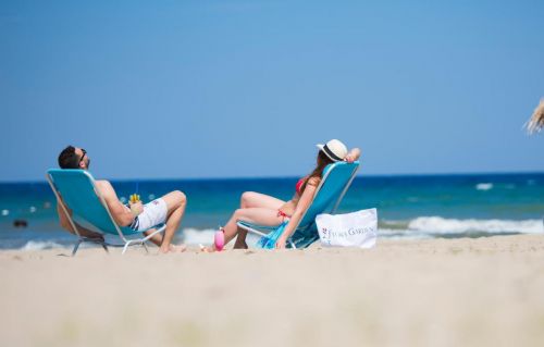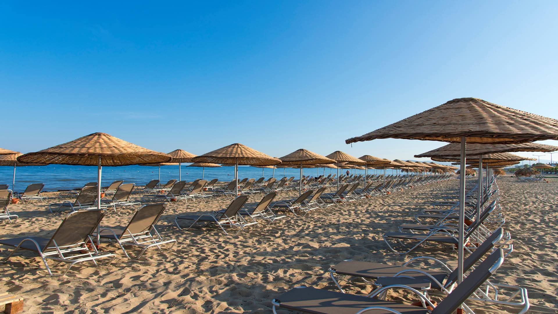 Собствен, пясъчен, притежаващ сертификат "Син флаг". Чадъри, шезлонги и плажни кърпи при басейна и на плажа - безплатно.