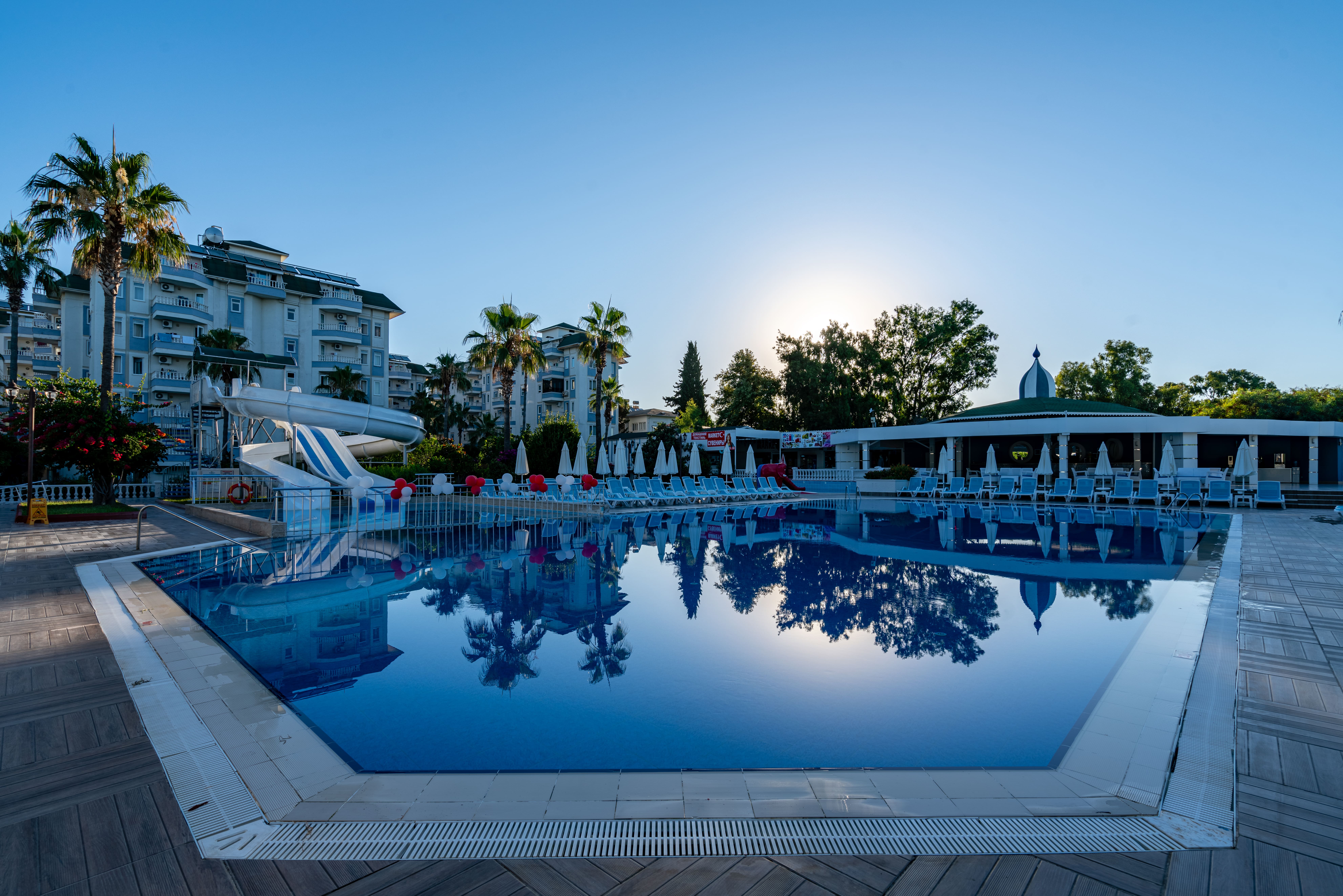 Хотелът разполага с основен ресторант, 3 бара, плувен басейн, детски басейн, водни пързалки, СПА център, фитнес, тенис на маса, тенис корт, конферентна зала.