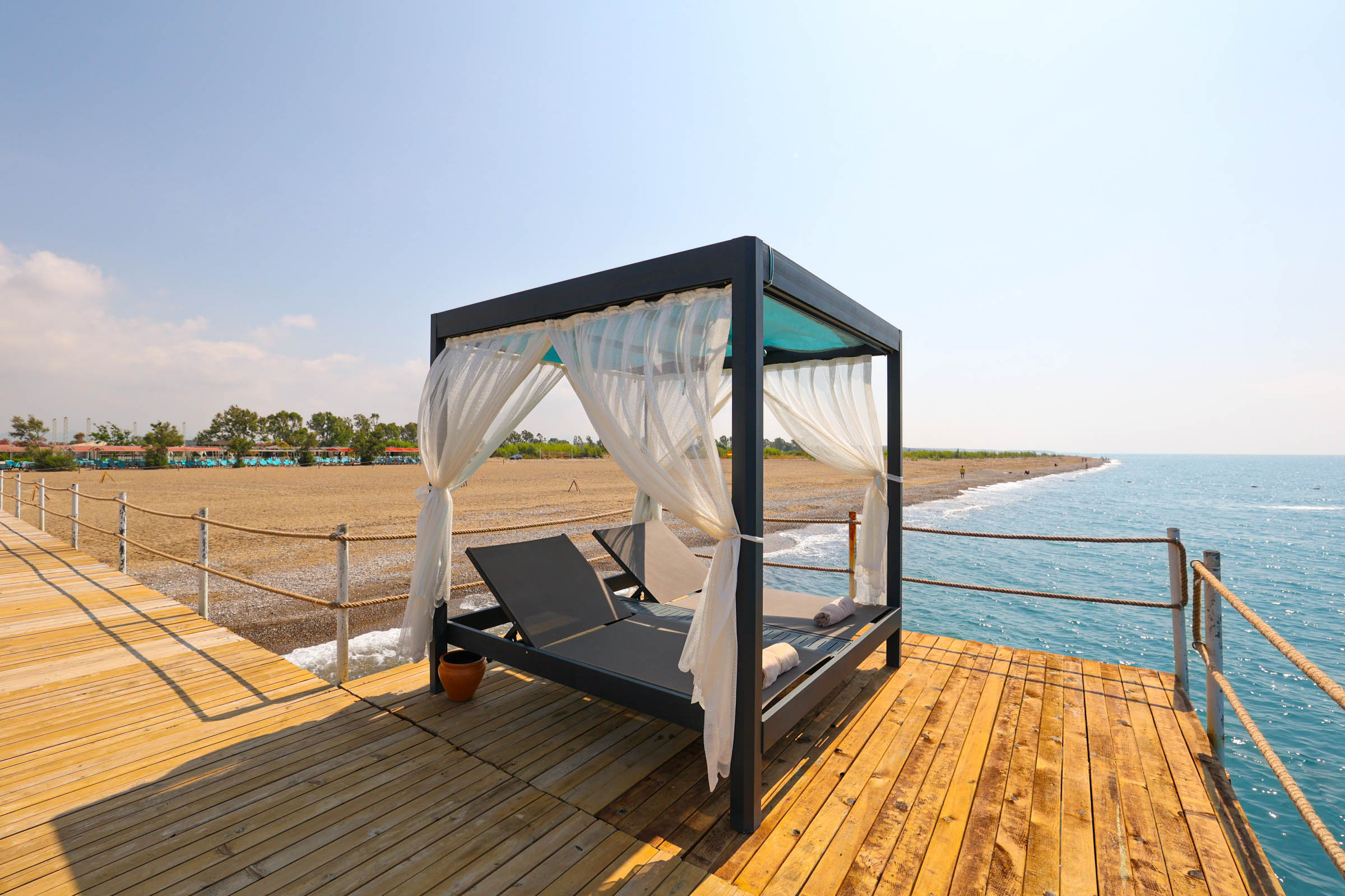 Собствен плаж с пясък и камъчета, на 500 метра от хотела. Безплатен транспорт до плажа по график. Чадъри, шезлонги на плажа и при басейна - безплатно. Плажни кърпи - срещу депозит.