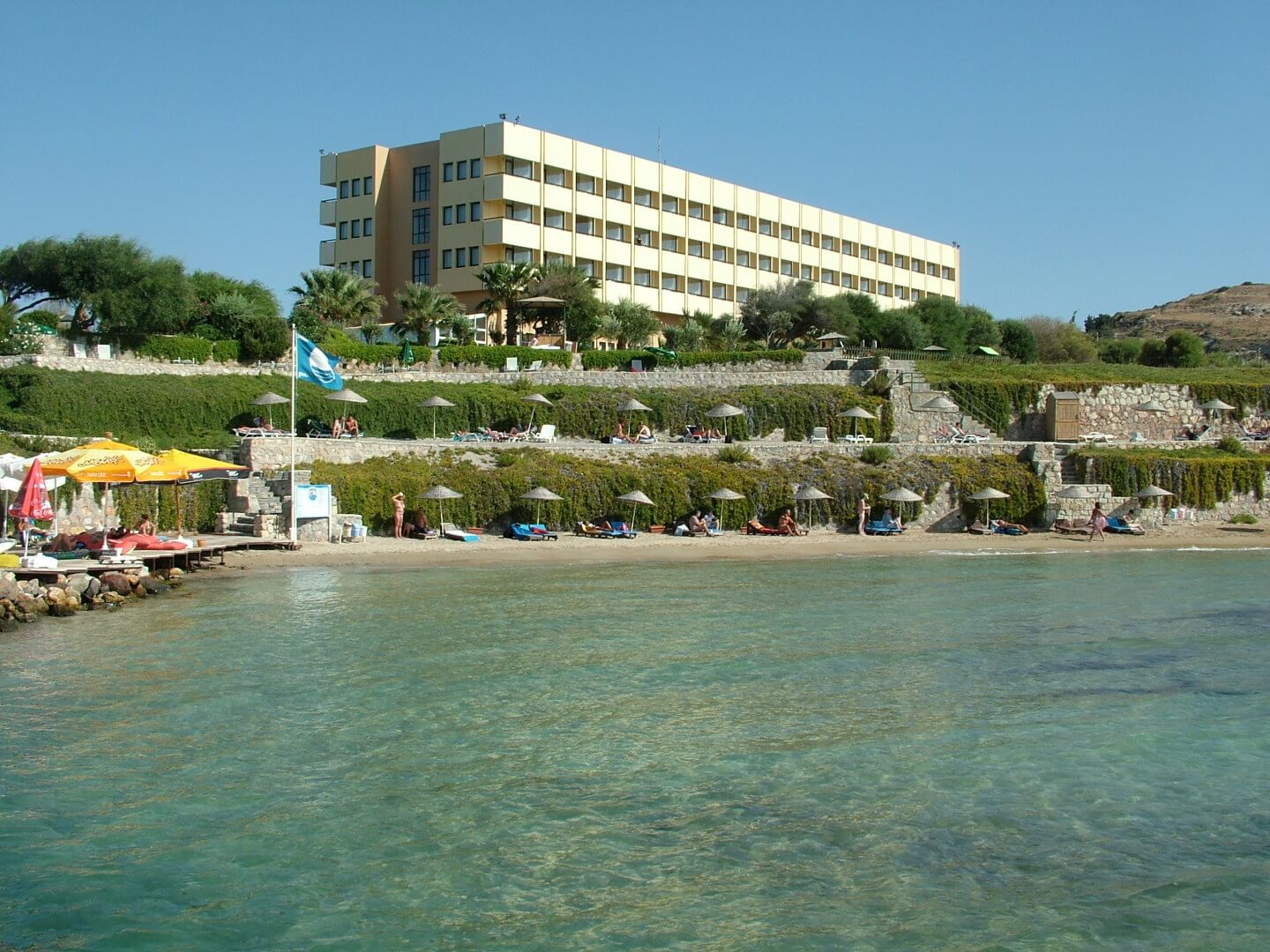 Плаж: дължина на плажната ивица 150 м. Разпределен на 3 нива – първите две нива са с фин пясък, а третото ниво е тревна площ . Морското дъно е с фин пясък плавно полегато. Плажът е удостоен със сертификат „Син флаг“. Има и платформа. Чадъри, шезлонги и матраци на плажа и при басейна- безплатно. Плажни кърпи - безплатно.