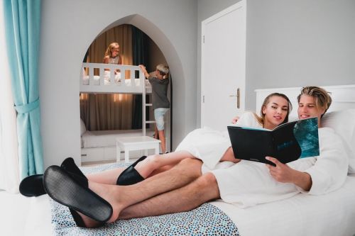 View/Back view, 45 м2), 82 Deluxe rooms (Partial Sea/Pool/Garden View, 45 м2), 64 Family rooms Bunk Bed (Garden/Pool/Partial Sea View, 45 м2), 22 Family Suites (Partial Sea/Garden/Pool View, 75 м2), 9 Junior Suites (Garden/ Sea View, 80 м2). Всички стаи са оборудвани с климатик, телевизор, телефон, баня с душ/вана, сешоар, сет за чай/кафе, минибар (платен), сейф (безплатен), балкон/тераса, Wi-Fi. Почистване на стаите и смяна на кърпи - всеки ден, смяна на спално бельо - 3 пъти седмично.