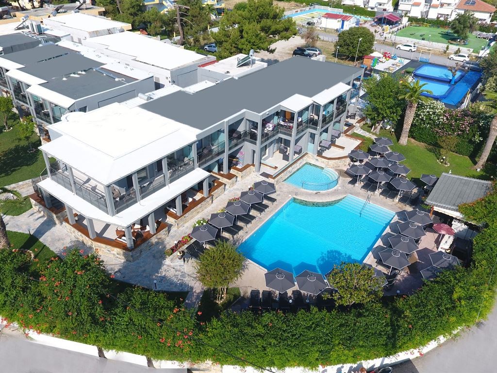 В Ханиоти, на 5 км. от Полихроно, на 5 км. от Пефкохори, на 90 км. от летище "Македония" в Солун. Триетажна сграда. В градчето има ресторанти, механи, барове, кафенета, великолепен пясъчен плаж и красив парк. Разтояние до плажа 100-300 м.