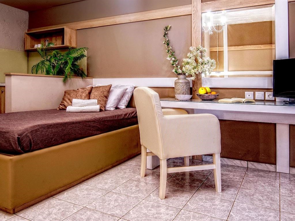 Раполага общо с 20 стаи: Studios 2 pax (~20 кв.м), Studios 3 pax (~20 кв.м), Family Apartments (~30 кв.м).