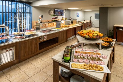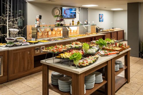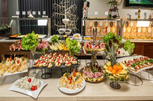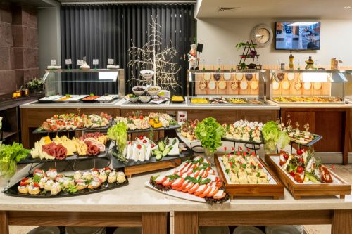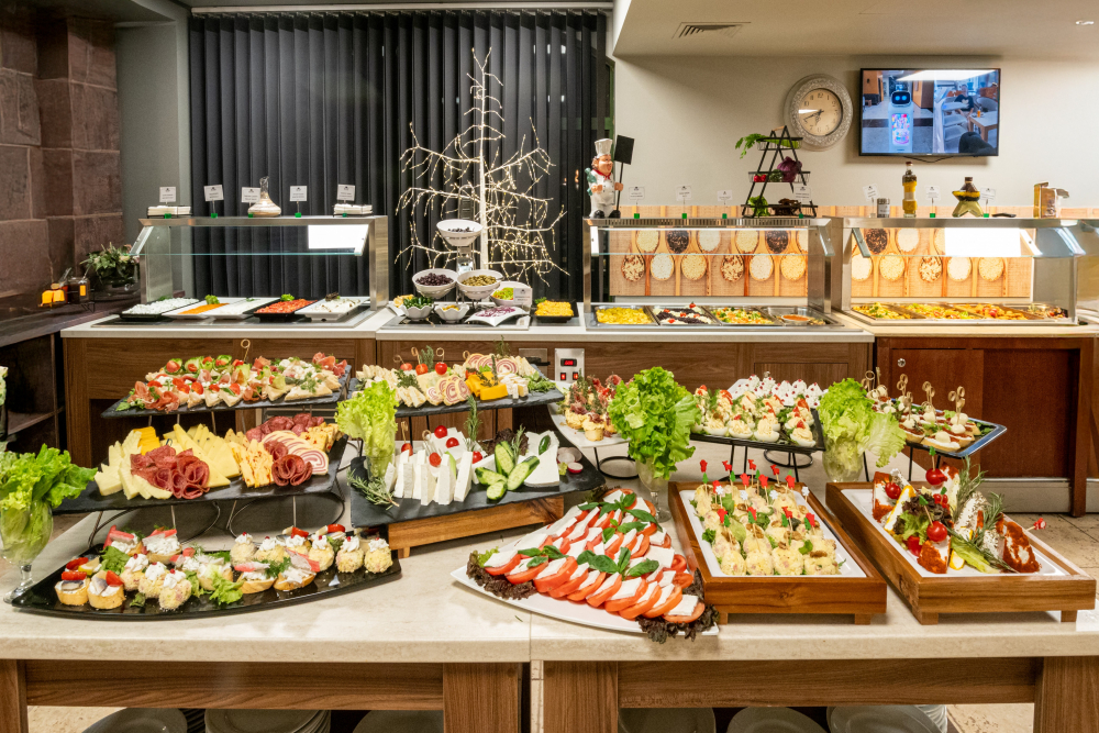 Закуска /08:00 - 10:00 ч./ - на блок маса в основен ресторант - разнообразие от топли и студени ястия, яйчни специалитети, разнообразни млечни продукти, колбаси и сирена, сладкиши, зърнени храни, плодове. По време на закуска се предлагат топли и студени напитки от машина.