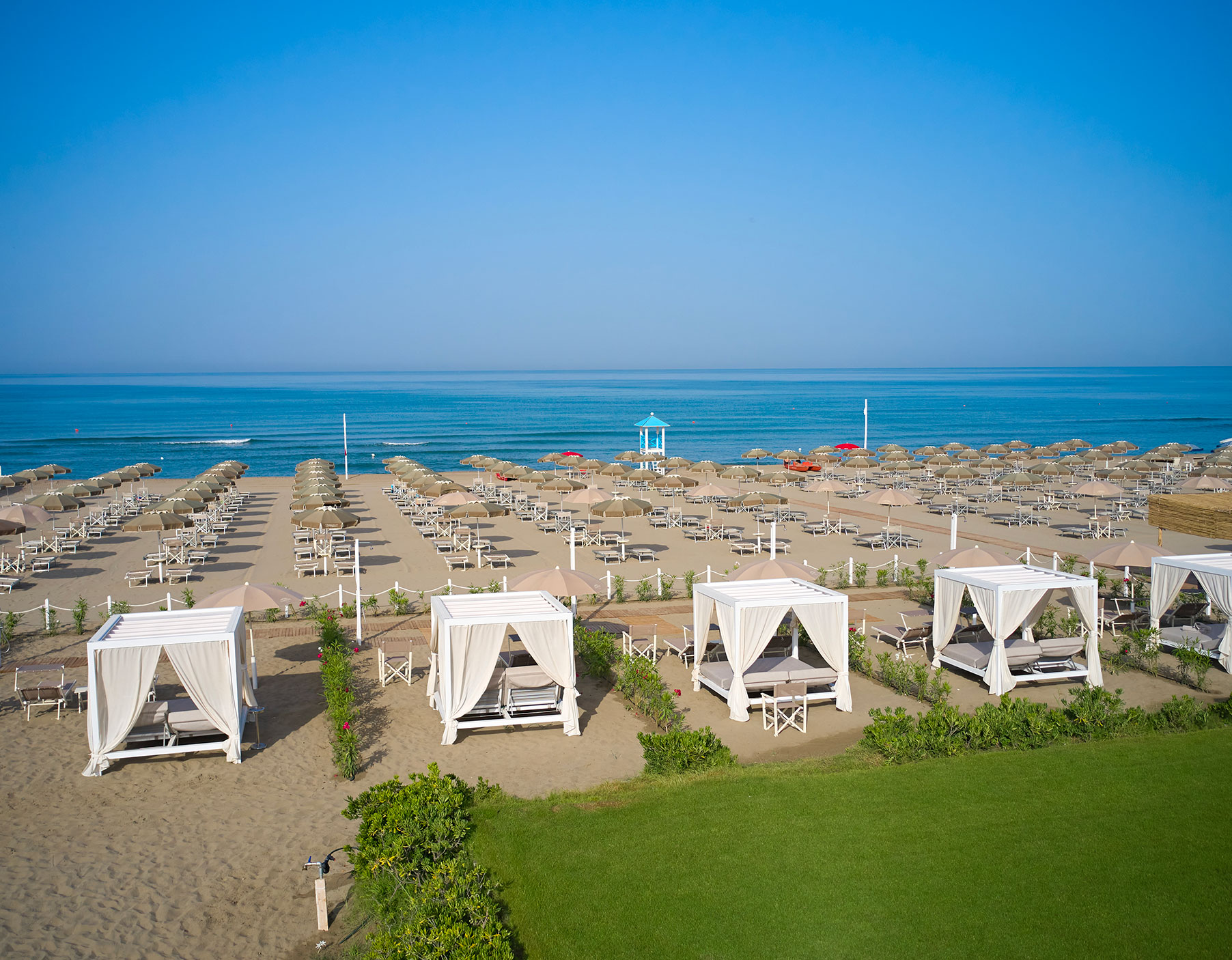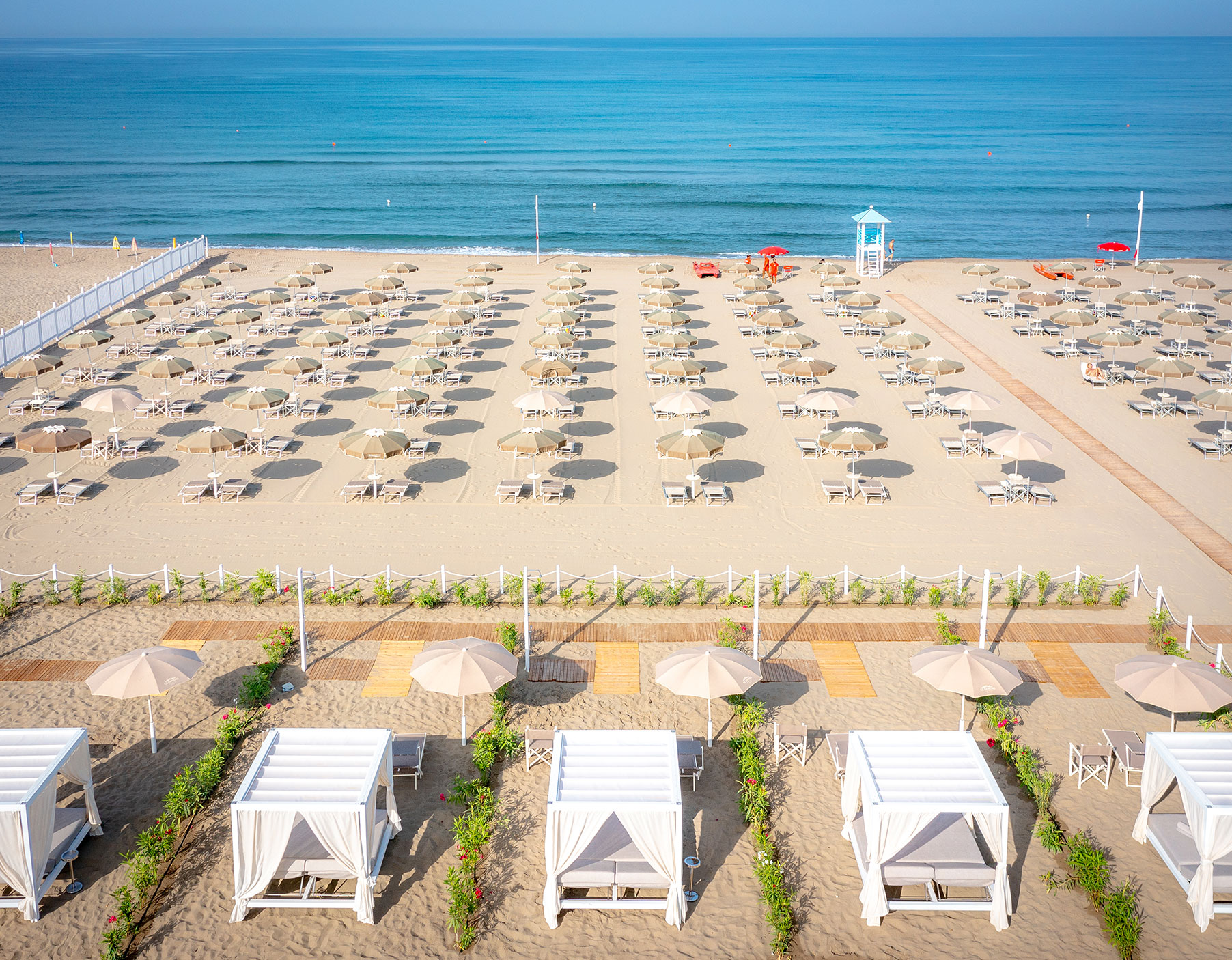 Собствен, пясъчен плаж на 250 метра от хотела (през борова гора). Чадъри и шезлонги на плажа се предоставят в периода от юни до септември. На първи и втори ред шезлонги и чадъри са срещу заплащане и изискват предварителна резервация, след трети ред са безплатни.