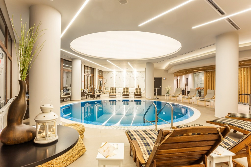 СПА център - вътрешен басейн и шезлонги около него, парна баня и арома парна баня, инфрачервена сауна, турска баня, арома сауна, билкова сауна, солна стая и фитнес.