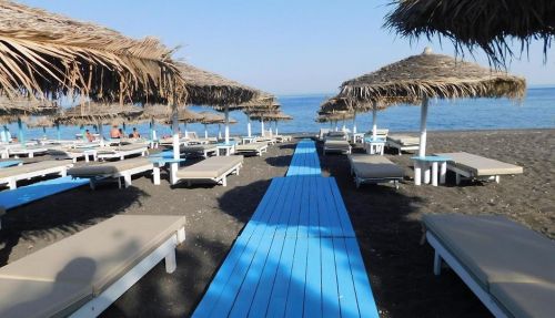 Пясъчен, черен плаж, чадъри и шезлонги срещу заплащане или консумация.