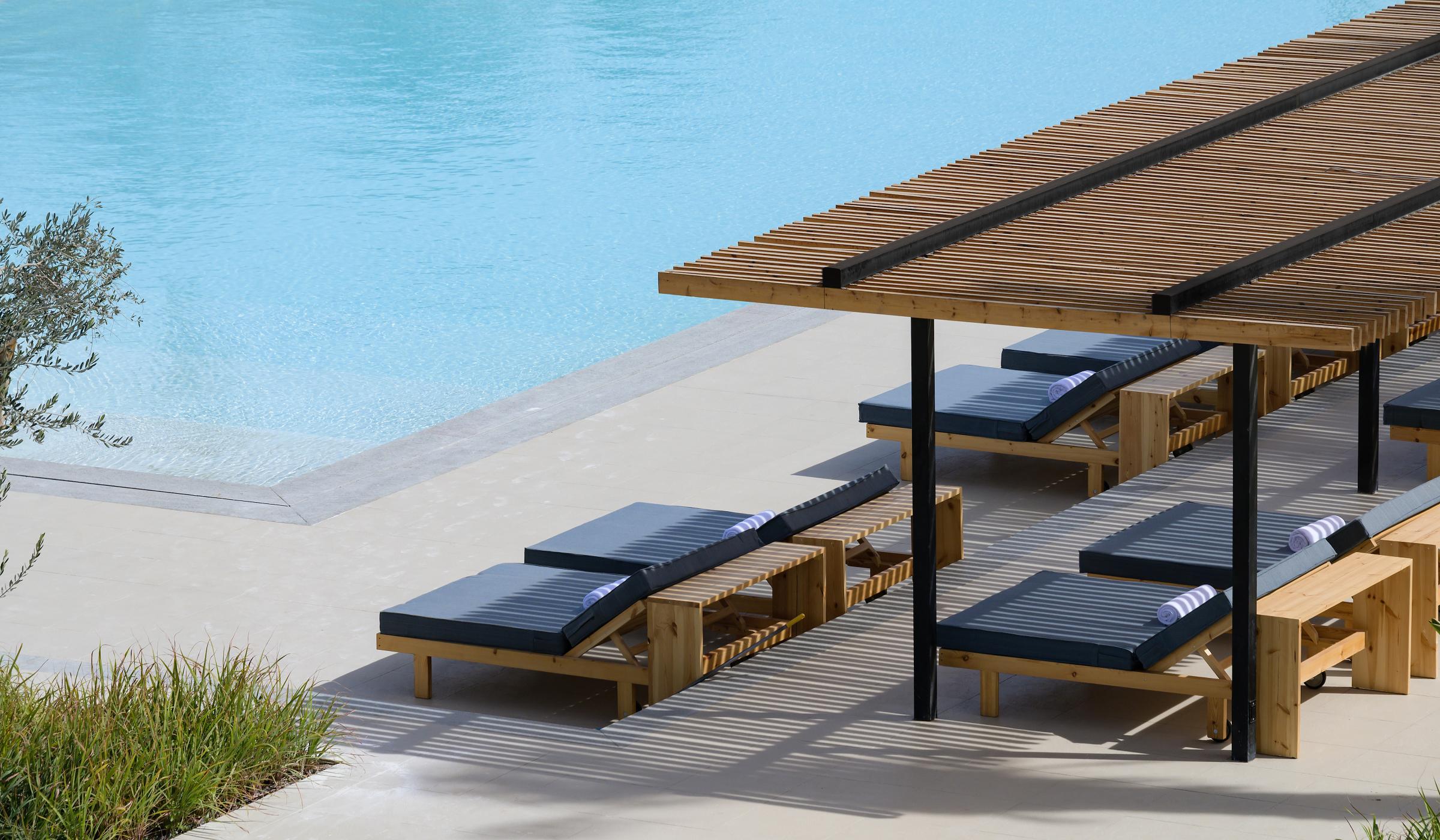 Собствен, пясъчен. Чадъри, шезлонги и матраци на плажа и при басейна - безплатно.