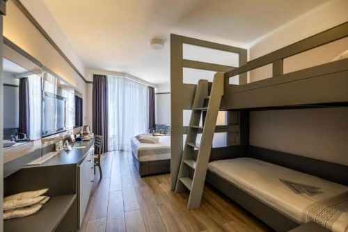 312 Standard Room (изглед суша или страничен изглед море - 24 м2), 4 Handicapped Room (пригодени за хора с ограничена подвижност - 24 м2), 45 Family BunkBed Room (двойно и двуетажно легло, изглед градина - 29 м2), 35 Family Room (2 спални, двойно и две единични легла - 42 м2), 56 Suite Room (две спални, двойно и две единични легла, хол, изглед море – 56 м2).