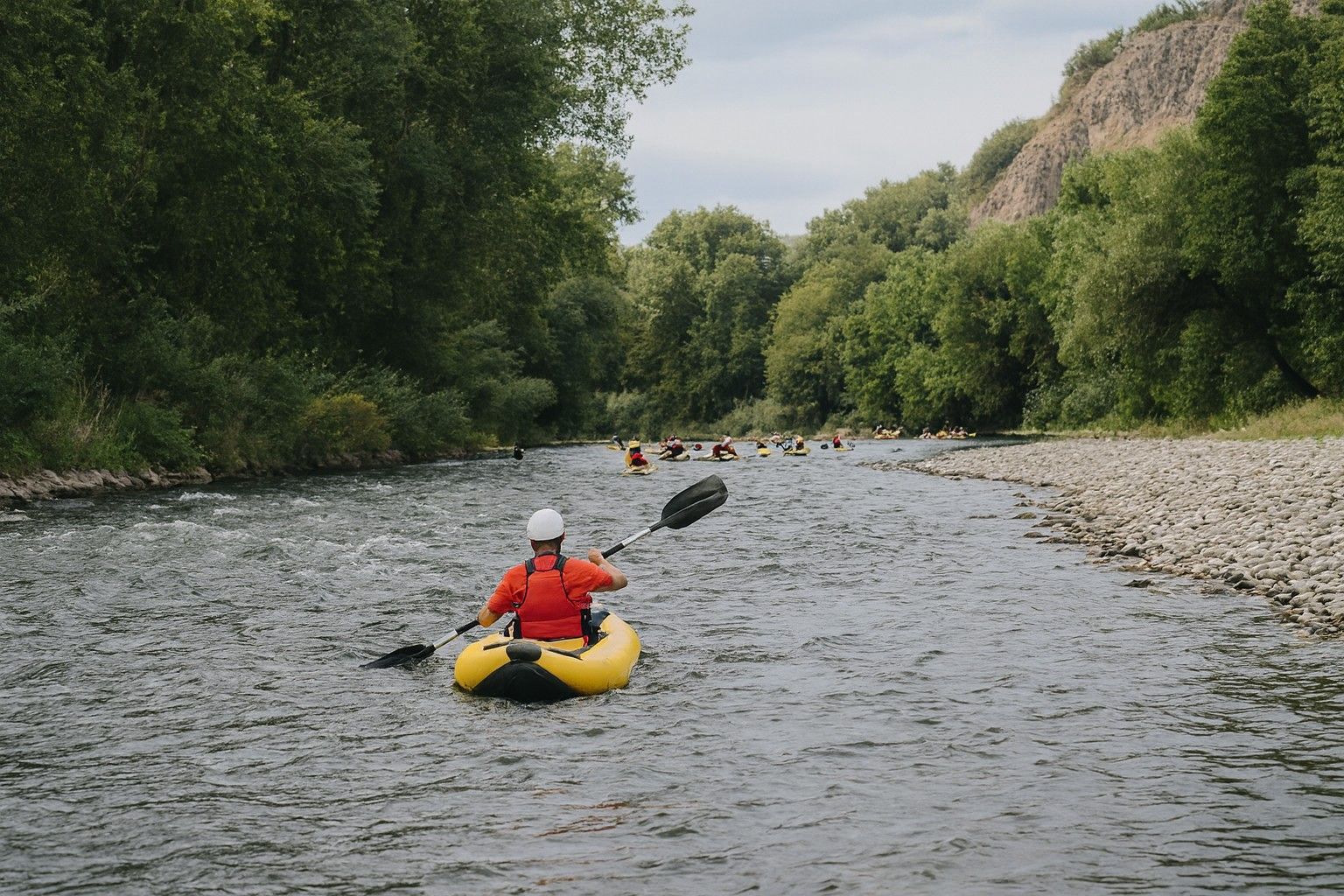 С двуместен гумен каяк ще споделите изживяването с партньор или инструктор, който ще ви въведе в основите на гребането и ще се погрижи за вашата безопасност. Не е необходим опит – само желание за ново предизвикателство и готовност да се насладите на всеки момент във водата. Очакват ви смях, енергия, лек адреналин и много усмивки!