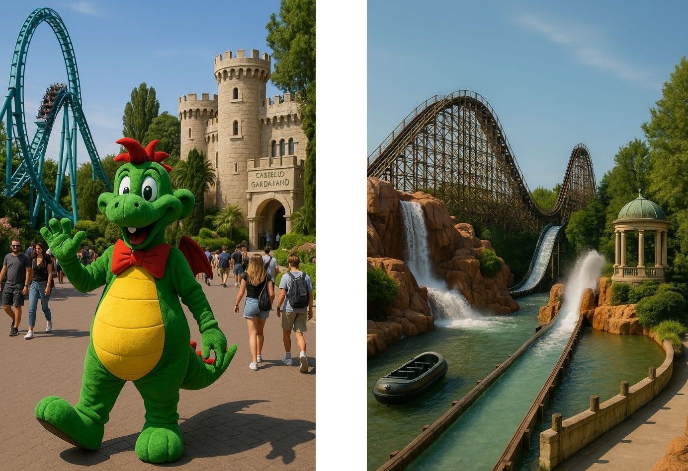Разположен на брега на езерото Гарда, близо до Верона и Венеция, Гардаленд е най-големият и най-популярният увеселителен парк в Италия. Открит през 1975 година, той днес е сред водещите туристически атракции в страната и ежегодно посреща милиони посетители от цяла Европа. Гардаленд предлага над 40 атракции и тематични зони, подходящи както за любители на силни усещания, така и за семейства с деца. Паркът е разделен на различни светове – от приключенски и фентъзи, до научно-фантастични и класически. Комплексът включва също Gardaland SEA LIFE Aquarium, където могат да се разгледат над 5000 морски създания, и Gardaland Hotel Resort – хотел с приказен дизайн, който позволява пълно потапяне в магията на парка. Гардаленд е домакин и на сезонни събития като Magic Halloween и Gardaland Magic Winter, които допълват преживяването със специални декорации и тематични програми. Гардаленд е мястото, където италианската креативност среща адреналина и фантазията – перфектната дестинация за семейна почивка или уикенд приключение.